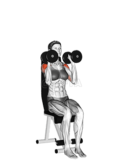 The Dumbbell Seated Shoulder Press is a strength-building exercise that primarily targets the deltoids, but also works the triceps and upper pectorals, aiding in the development of upper body muscle mass and overall shoulder stability. It's ideal for individuals of all fitness levels, from beginners to advanced athletes, looking to improve their upper body strength and definition. People may want to incorporate this exercise into their routine to enhance their physical performance in sports or daily activities, improve posture, or achieve a more toned and sculpted upper body appearance.